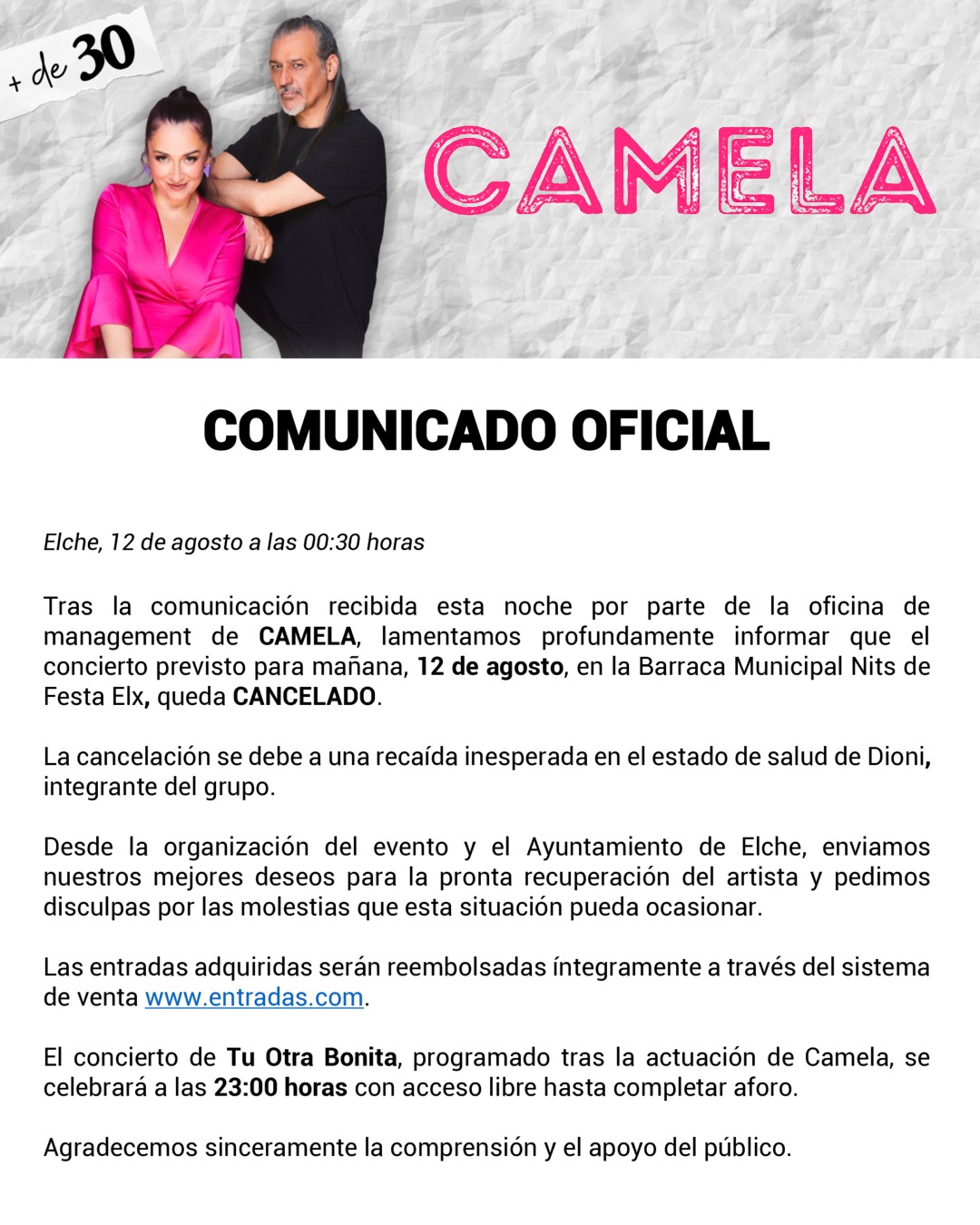 CANCELADO - - - CAMELA “+ DE 30 AÑOS”